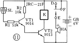 继电器电路 见图9 。继电器K选用JRC—21F等超小型弱功率电磁继电器,线圈电压选6V,消耗功率0.36W。由于继电器线圈工作电流60mA,比玩具电动机工作电流小,比蜂鸣器、发光二极管工作电流大,因此设计电路时各元件参数介于两者之间,图中参数供参考。在图9继电器电路中,F为衔铁,D为常闭触点,E为常开触点。当控制开关S闭合时,继电器吸合,常开触点F-E接通,发光二极管VD1点亮,R2为限流电阻器。图9控制开关S换成干簧管开关、双金属复片开关,就可以进行磁控和热控自动控制了。继电器触点可以根据需要选用常开或常闭触点。由于继电器触点与传感控制电路隔离,选用JRX型继电器,其触点可以接220V交流电,直接驱动交流电用电器。这些简单的自动控制器有什么用途呢?比如,利用荧(日)光灯中启辉器中的双金属复片,改制成可控温度传感器,制作成简易电子恒温箱、酸奶器,甚至炕头孵化鸡蛋的过热、过冷报警器等。